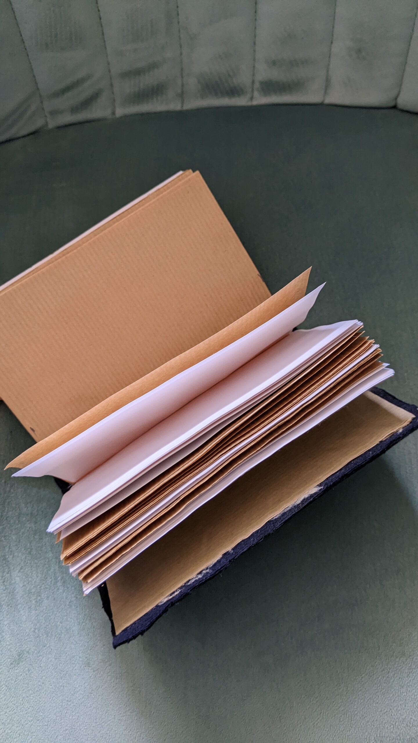 Carnet de croquis ou de notes format A6 fait main, couverture carton recouverte de tissu, illustration unique. Alternance de papier kraft et papier blanc simple à l’intérieur. Reliure robuste par petits paquets cousus et collés, dos en tissu. 176 pages, petit format à emporter partout, modèle unique.